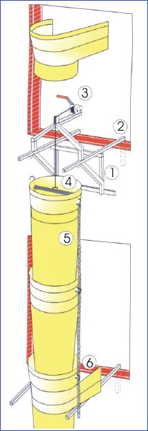 - Wciągamy segmenty zsypu doczepiając kolejne elementy. Uwaga: jeżeli w zestawie używamy segmentów wlotowych pośrednich (6) należy tak dobrać długości łańcuchów aby wloty wypadły na wybranych piętrach. Należy to zrobić przed montażem.